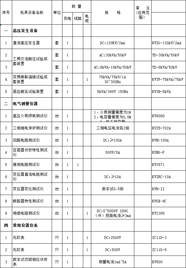 |  | . 承装(修、试)电力设施许可证所需施工机具设备清单及选型依据 承试类四级 设备清单     选型依据      近几年来国家能源局电监办对电气试验监管更加严格,施工单位必须取得承装(修、试)电力设施许可证,分为五个等级。对施工设备,人员技术资格,生产管理方面进行了严格的规定。四级资质可以对35kV等级及以下电力设备进行电气试验。对于部分客户对电监办清单设备的应用范围不理解,我对35kV变电站,所有的电气试验进行了概括。  接地电阻测试: